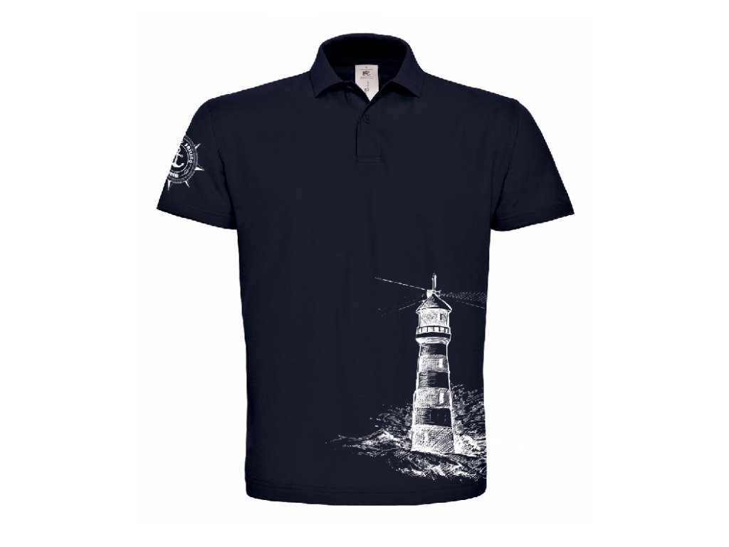 Nový design pánské polokošile Tetris Sailing v barvě Navy Blue s bílým potiskem majáku a plachetnic.